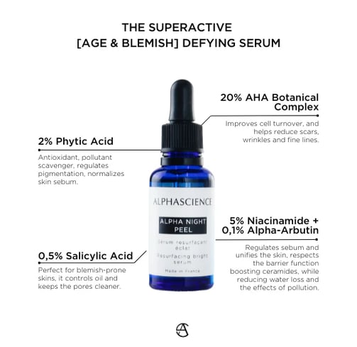 ALPHA NIGHT PEEL prevents, smoothes and acts on persistent signs of aging. It fights against external factors such as pollution and free radicals.